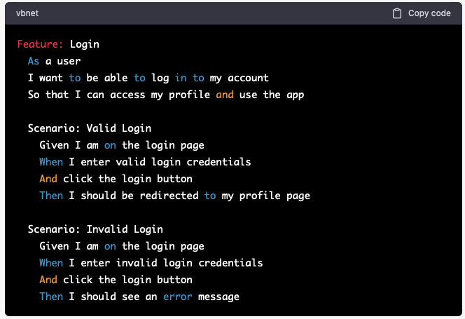 In the above example, the feature is "Login" and there are two scenarios: "Valid Login" and "Invalid Login". Each scenario has its own set of steps that are defined using the Given-When-Then syntax. The steps can be implemented using any programming language that supports cucumber, such as Ruby or Java. Once the steps have been implemented, the tests can be run to verify that they are working correctly.
