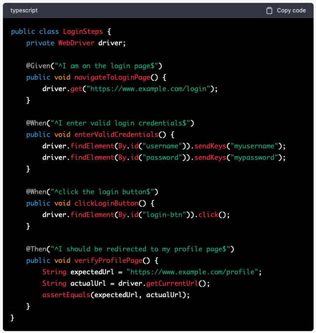 Here's an example of how you can automate the cucumber test we defined earlier using Selenium and Java: