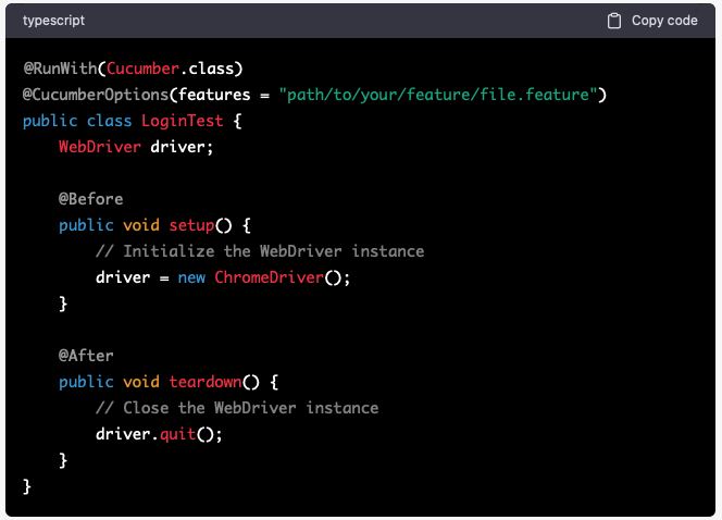 - Write the test code: Write the code that will automate the cucumber tests using the chosen automation framework. This code will execute the steps defined in the cucumber feature files.